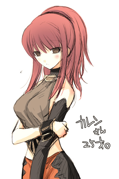 1girlblushbreastsbrown eyeselbow glovesfemale focusglovesgrey eyeslarge breastsmidriffponytailred hairsimple backgroundsingle elbow glovesingle glovesoloturtleneck