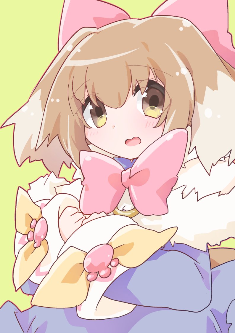 1girlanimal earsblue capeletblue dressbrown eyesbrown haircapeletdog earsdog girldog taildressfur capeletgreen backgroundhair ribbonneck ribbonopen mouthpink ribbonribbonsolotail