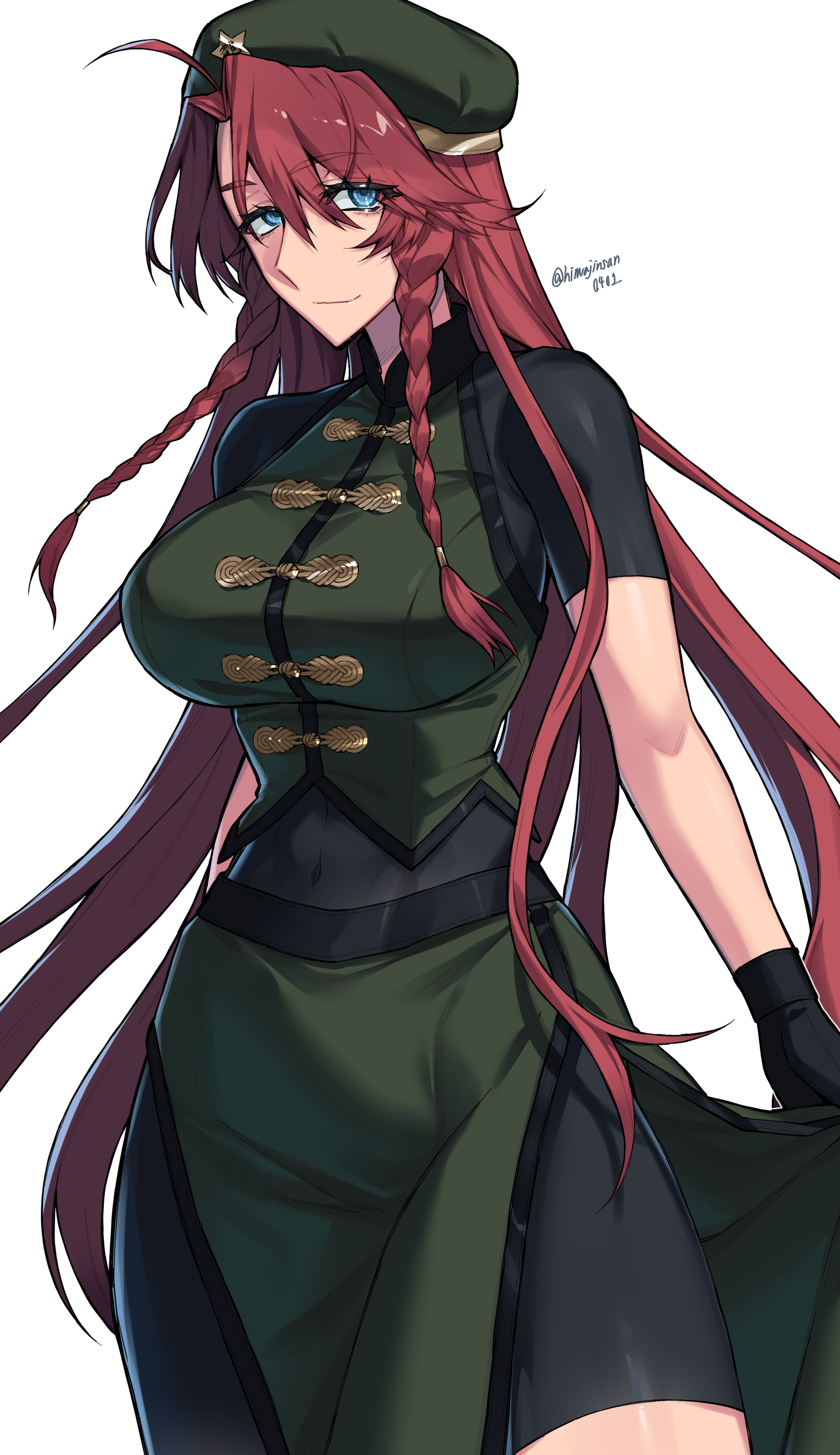 1girlahogeberetblack glovesblue eyesbraidbreastschina dresschinese clothesclosed mouthcovered naveldressglovesgreen hatgreen shirtgreen skirthair between eyeshatlarge breastslong hairlong sleevespelvic curtainred hairshirtshort sleevesside braidsimple backgroundskirtskirt holdsleevelesssleeveless shirtsmilesoloswept bangstwin braidsvery long hairwhite background