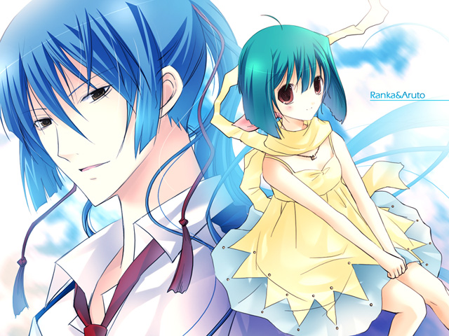 00s1boy1girlahogebare shouldersblue hairbraceletcollared shirtdressgreen hairjewelrylooking at viewerred eyesshirtshort hairsleevelesssleeveless dresssundresswhite shirtyellow dress