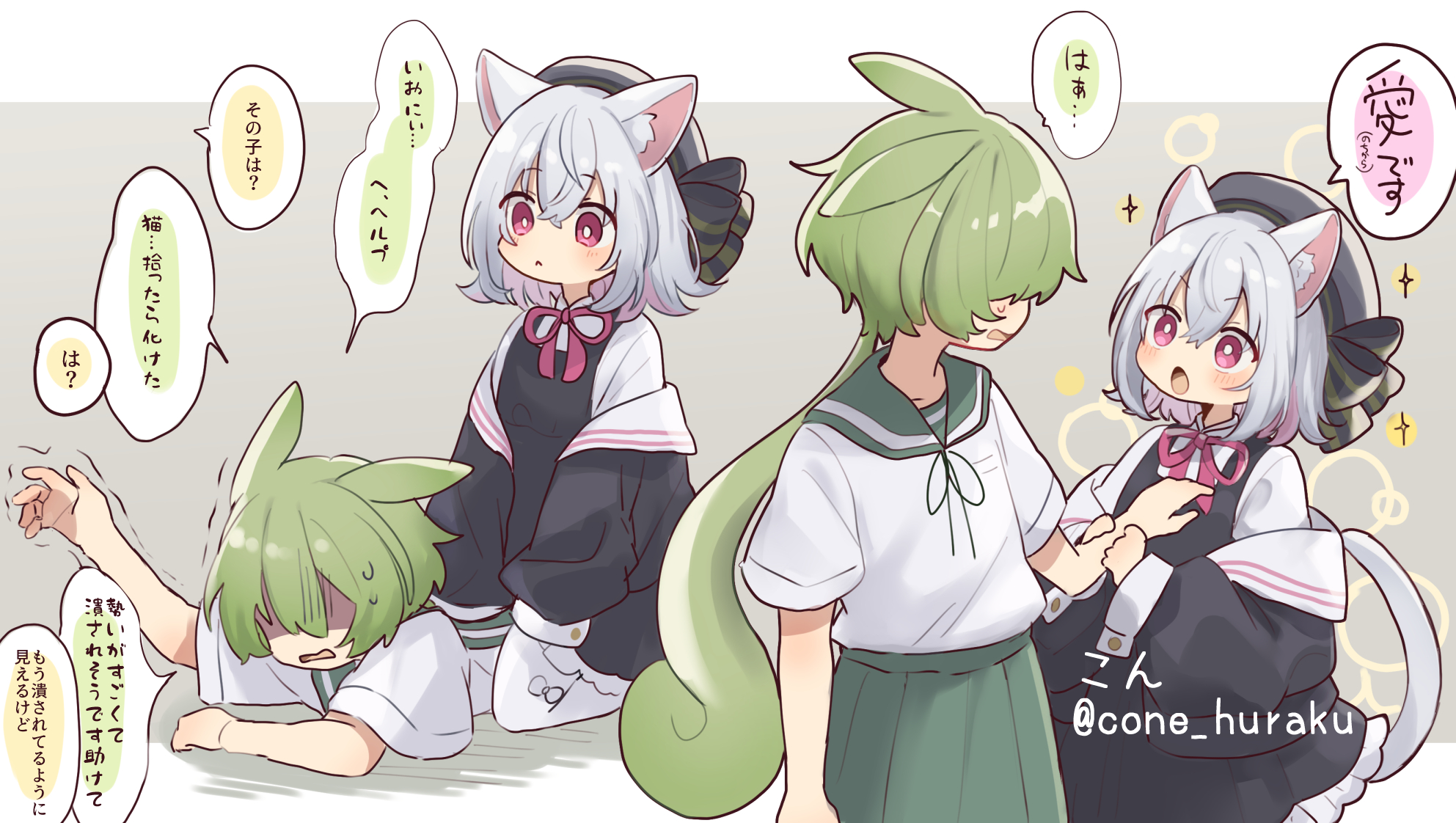 2girlsanimal ear fluffanimal earsberetbowcat earscat girlcat tailfrilled skirtfrillsgreen hairgrey hairhathat bowholding another's wristjacketlong hairlong sleeveslooking at anotherlow ponytailmultiple girlsneck ribbonoff shoulderopen mouthoutstretched armpantyhosepink eyesponytailreachingribbonschool uniformserafukushaded faceshort hairshort sleevessittingsitting on personskirtsparklesweattailtremblingvery long hair