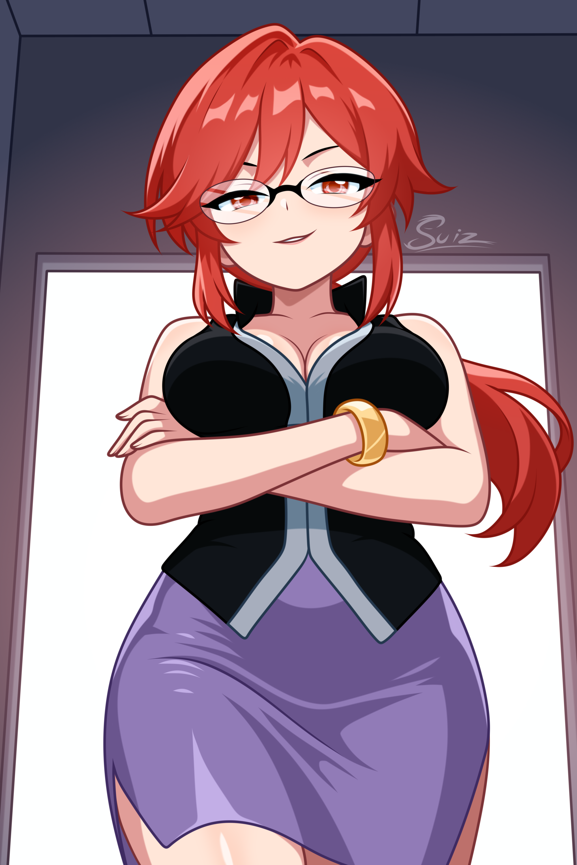 chimi (s2yuyukos2), moriya suwako, yasaka kanako, touhou, commentary, highres, symbol-only commentary, 2girls, blonde hair, blue hair, blush, breasts, closed mouth, hug, layered sleeves, long hair, long sleeves, looking at viewer, mirror, multiple girls, no headwear, purple skirt, purple vest, red eyes, red shirt, shirt, short hair, short over long sleeves, short sleeves, simple background, skirt, skirt set, smile, vest, white background, yellow eyes, yuri