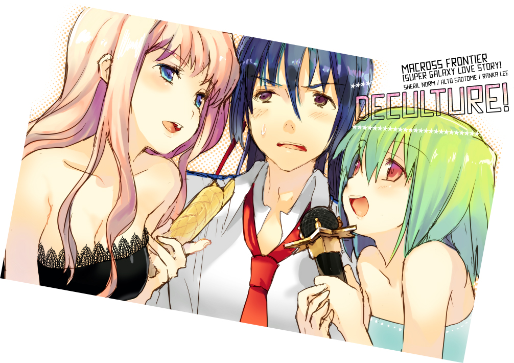 00s1boy2girlsbare shouldersblue eyesblue hairblushgreen hairlong hairmicrophonemultiple girlsnecktiepink hairred eyesshort hair