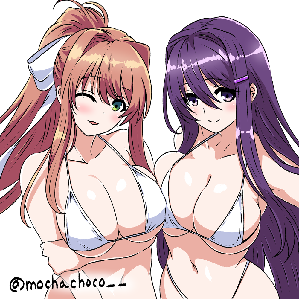 :dbare armsbikiniblushbreast pressbreastsbrown haircleavageclosed mouthcollarbonegreen eyeshair between eyeshair ornamenthair ribbonhaircliplarge breastslong hairlooking at viewernavelone eye closedopen mouthpurple eyespurple hairribbonsidelockssimple backgroundsmileswimsuitupper bodyvery long hairwhite backgroundwhite bikini