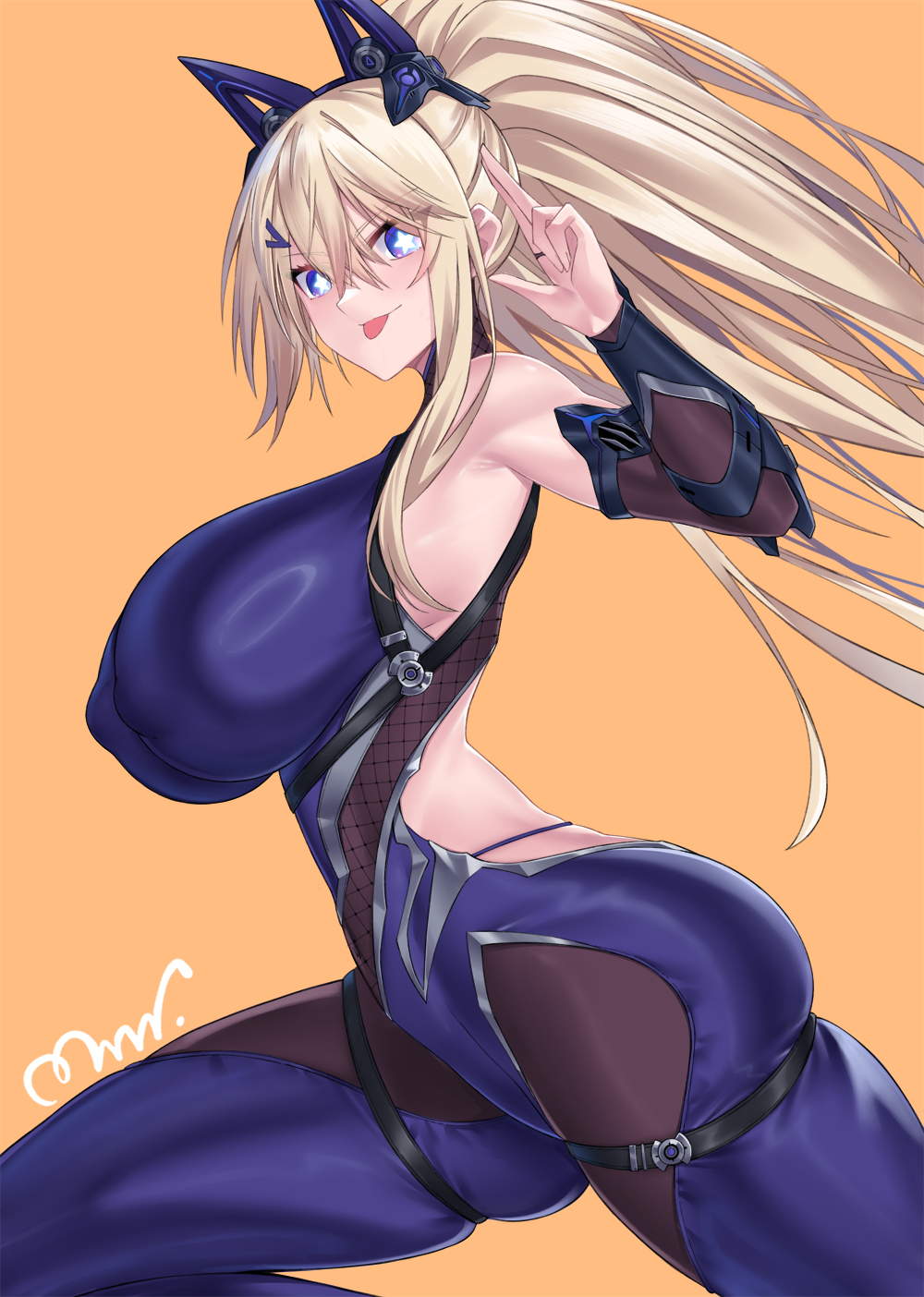 :p1girlblonde hairblue eyesbreastscovered erect nipplescrossed bangsfrom sidehand uphigh ponytailhuge breastslooking at viewerninjaofficial alternate costumeorange backgroundponytailsignaturesimple backgroundskindentationsolostar (symbol)star-shaped pupilssymbol-shaped pupilsthigh straptonguetongue out
