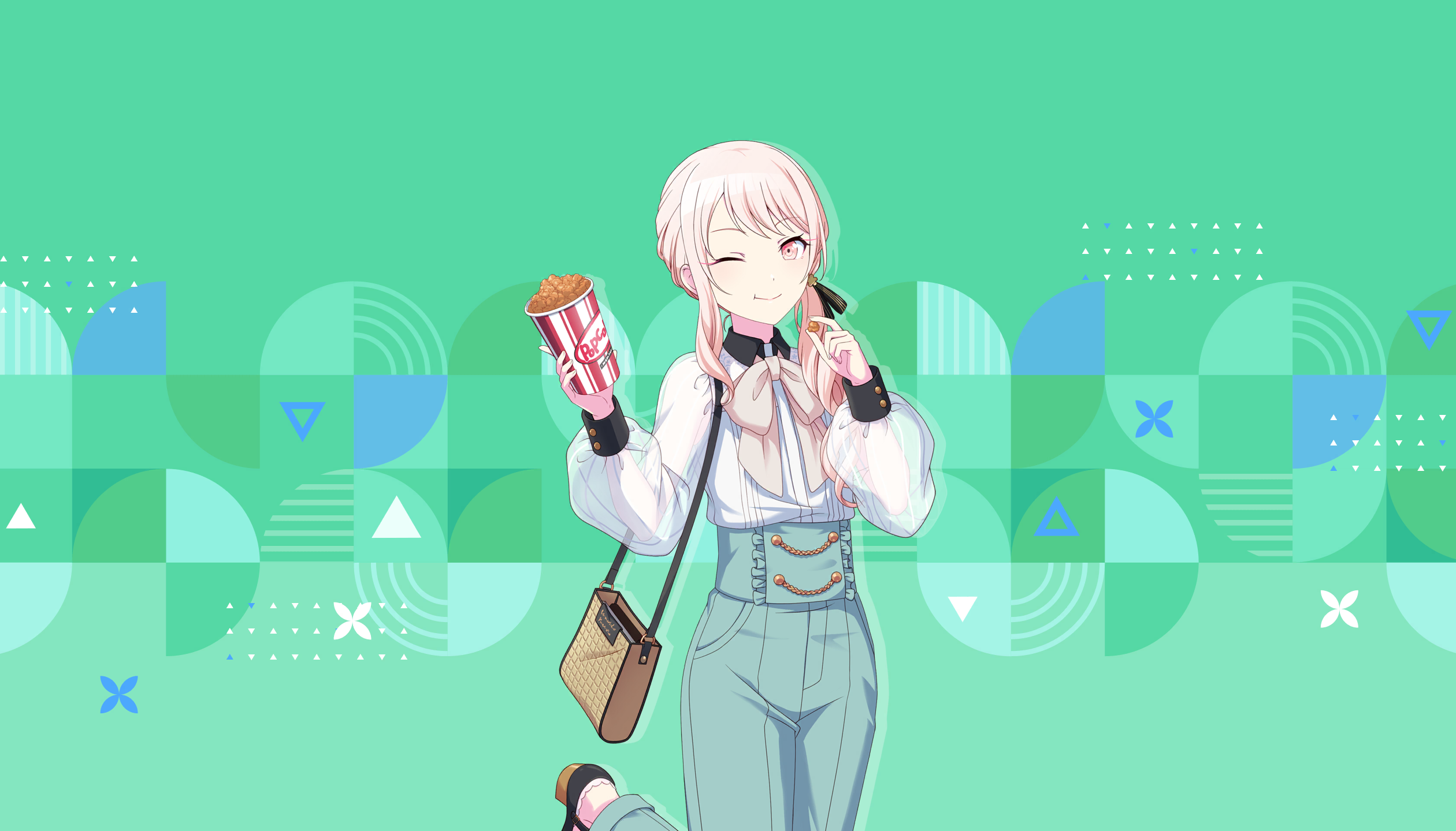 :t1otheralternate costumealternate hairstylebagblack ribbonblack shoesblue pantsbowbrown bagcollared shirtcupfoodgreen backgroundhair ribbonholdingholding cupholding foodlong sleevespantspink bowpink eyespink hairpopcornpuffy long sleevespuffy sleevesribbonsee-through clothessee-through sleevesshirtshirt tucked inshoesshoulder bagsolotrianglewhite shirt