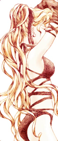 1990s (style)1girlblonde hairbreastsearringsfemale focusjewelrylong hairponytailretro artstylesimple backgroundsolovery long hair