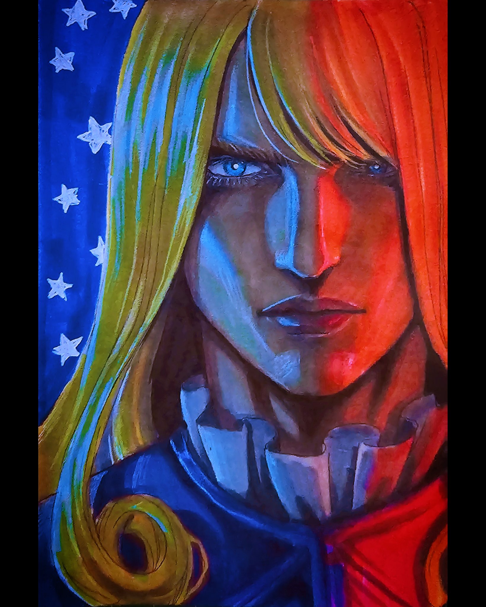 1boyandrogynousblonde hairblue backgroundblue coatblue eyesclosed mouthcoatcurly hairlipslong hairlooking at viewermale focusmulticolored coatparted bangspillarboxedportraitred coatsolostar (symbol)star printtwo-tone coat