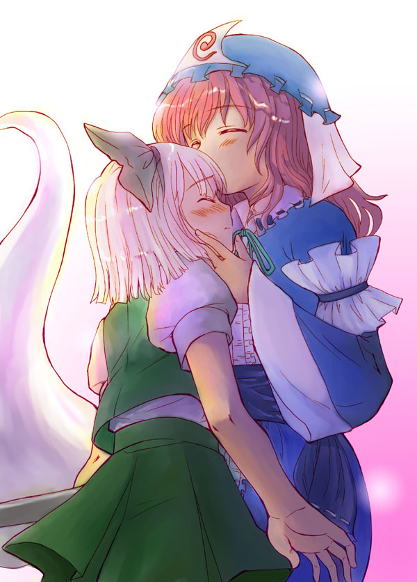 2girlsblushclosed eyesfemale focushair ornamenthairbandhatjapanese clotheskimonokisskissing foreheadmultiple girlspink hairshort hairyuri