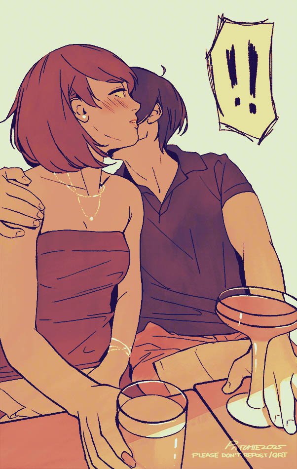 1boy1girlalternate costumebare shouldersblue hairblue shirtblushbraceletbreastsbrown eyesbrown haircollarbonecouplecupdrinkearringshand on another's shoulderholdingholding cupimplied kissjewelryleaning on personlooking to the sidenail polishnecklaceparted lipspink nailsprofilesepiashirtshort hairshort sleevessittingspoken exclamation markstraplessstrapless shirtstud earringssurprisedtableupper body