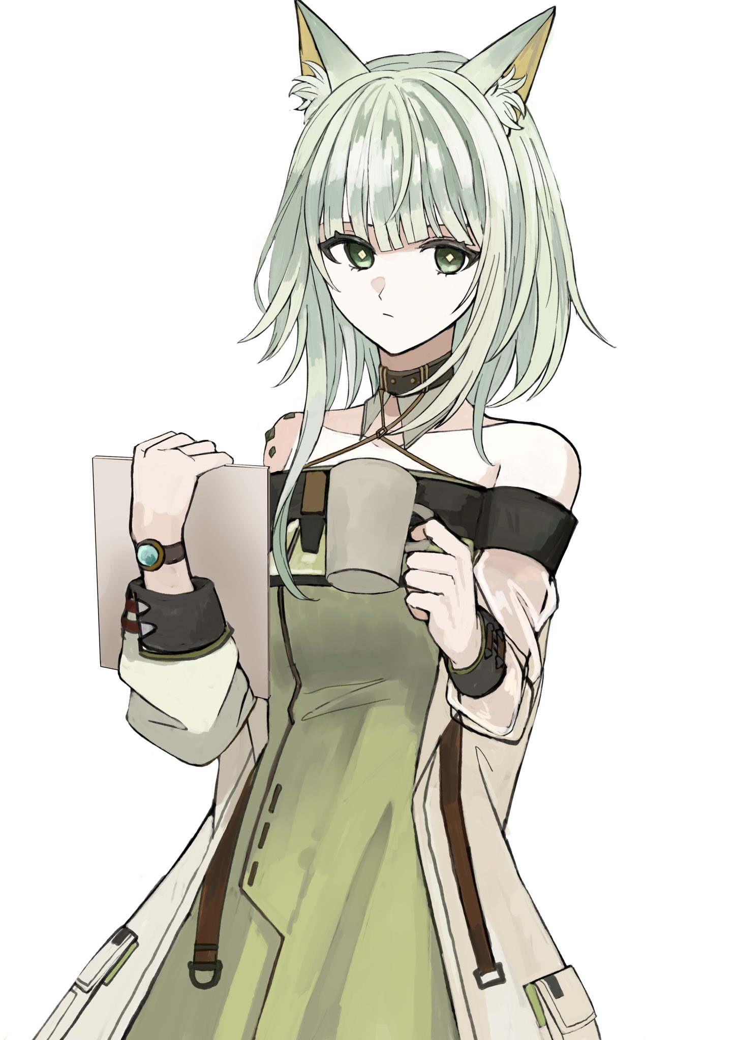 1girlanimal ear fluffanimal earsbare shouldersclipboardclosed mouthcowboy shotcupdiamond (shape)diamond-shaped pupilsgreen eyesgreen hairhalterneckholdingholding clipboardlong sleeveslooking at viewermaterial growthmugoff shoulderoripathy lesion (arknights)short hair with long lockssimple backgroundsolostandingsymbol-shaped pupilswatchwhite backgroundwristwatchyellow pupils