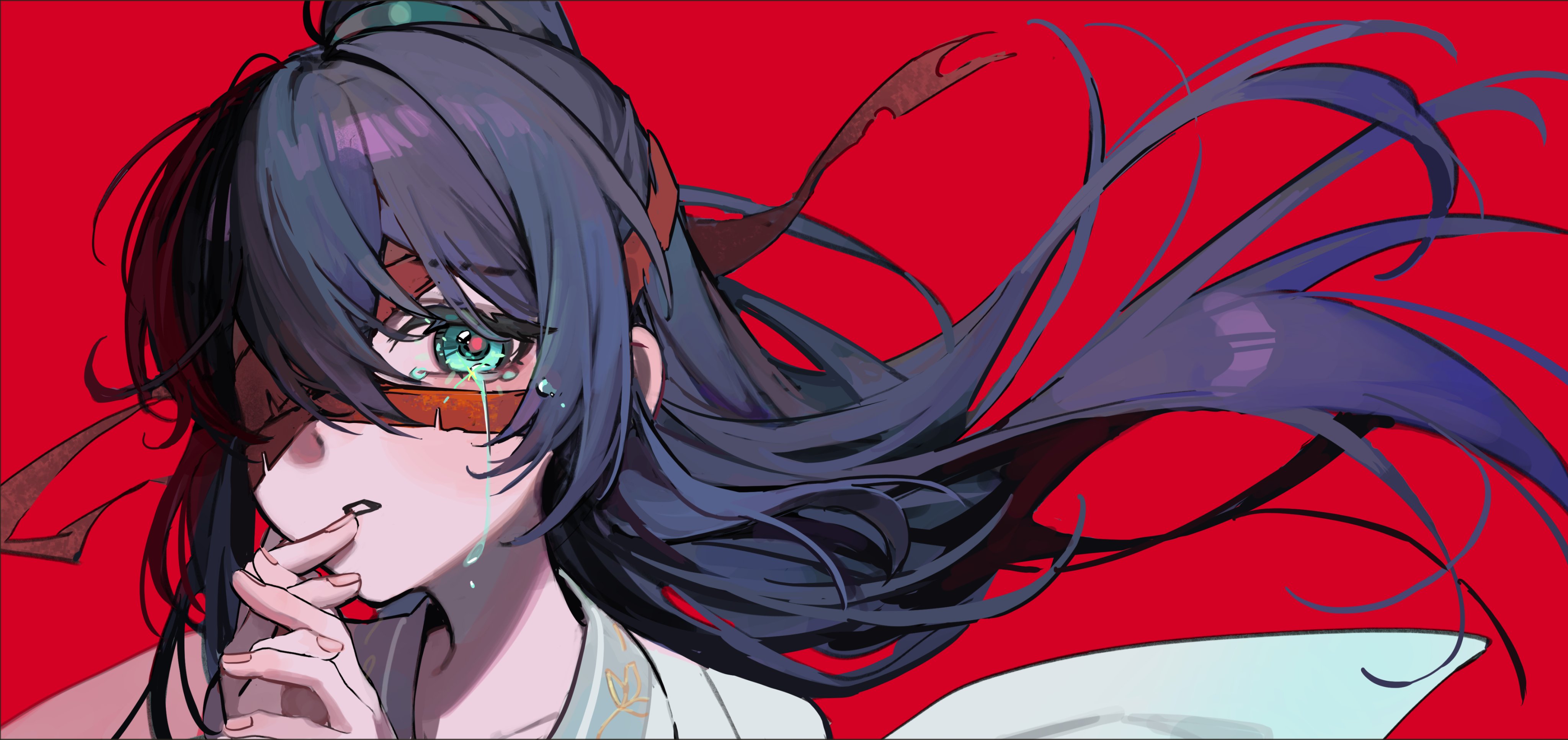 1boyaged downbandage over one eyeblack hairblue eyeschinese clothescryingcrying with eyes openhanfuhigh ponytaillong hairlooking at viewermale focusponytailred backgroundsimple backgroundsolotearsupper bodywhite hanfu