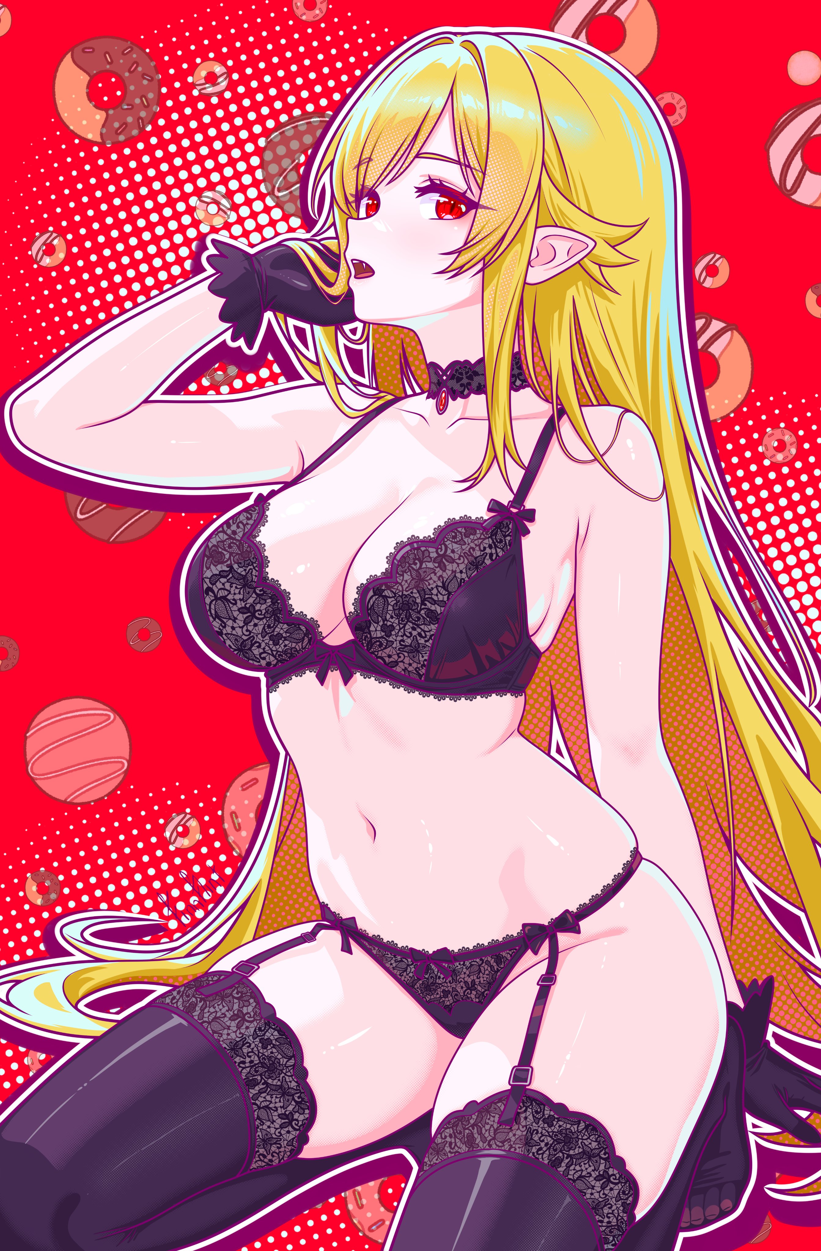 1girlbare armsbare shouldersblack brablack chokerblack glovesblack pantiesblack thighhighsblonde hairbrabreastschocolate donutchokercleavagecollarbonedonutdonut backgroundfangfoodfull bodygarter beltgemgloveshand in own hairlarge breastslingerielong hairnavelopen mouthpantiespointy earspolka dotred backgroundred eyesred gemstoneseizasidelockssittingslit pupilssolostomachstraight hairthighhighsthighsunderwearvery long hair