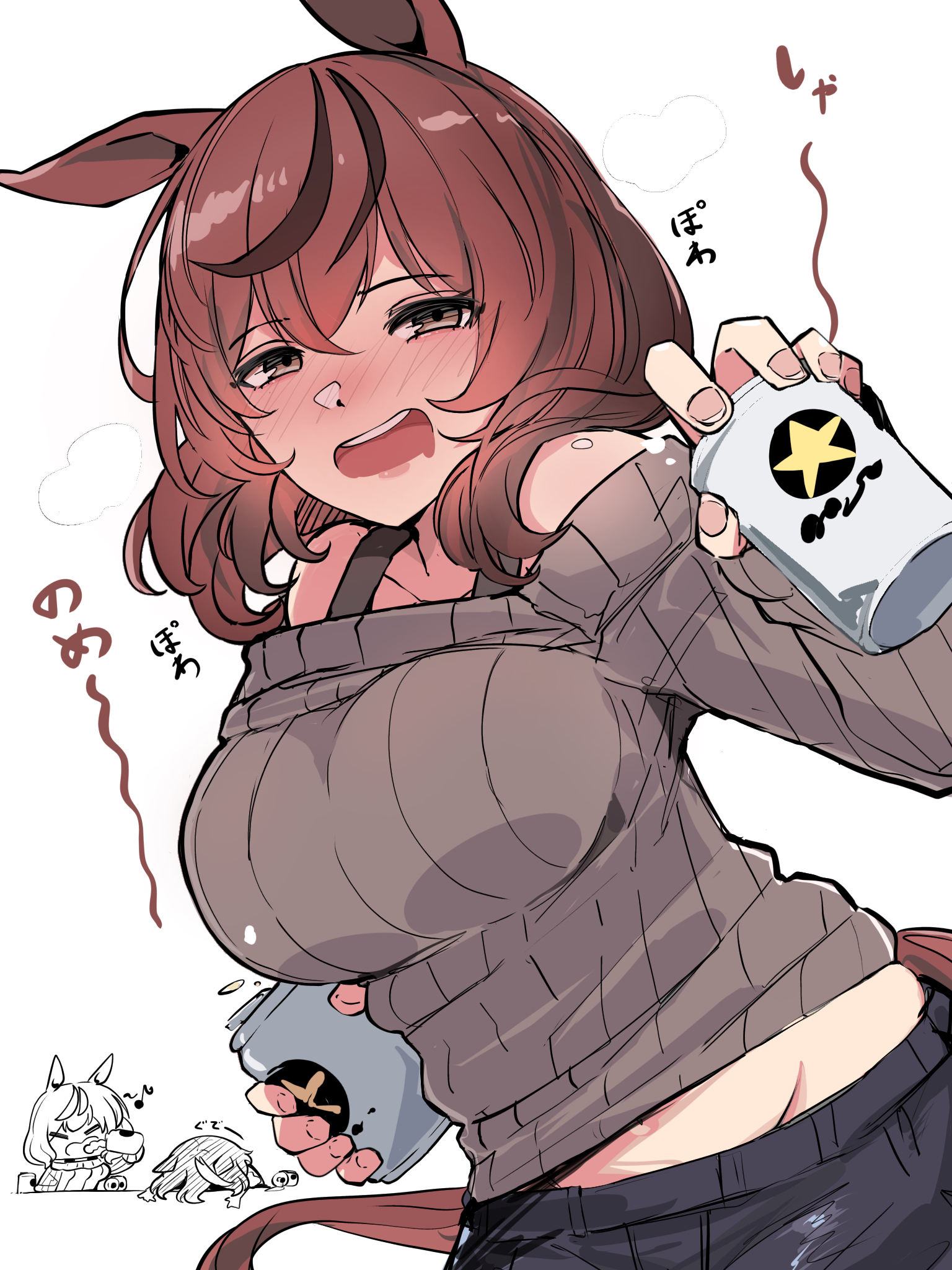 2girlsanimal earsbeer canblushbowbreastsbrown eyesbrown hairbrown sweatercandrinkdrink candrunkgroinhair between eyesholdingholding canholding drinkhorse earshorse girlhorse taillong sleeveslooking at viewermedium breastsmedium hairmulticolored hairmultiple girlsnavelnose blushoff shoulderoff-shoulder sweateropen mouthribbed sweatersapporo beershirtsimple backgroundsmilestreaked hairsweatertailwhite background