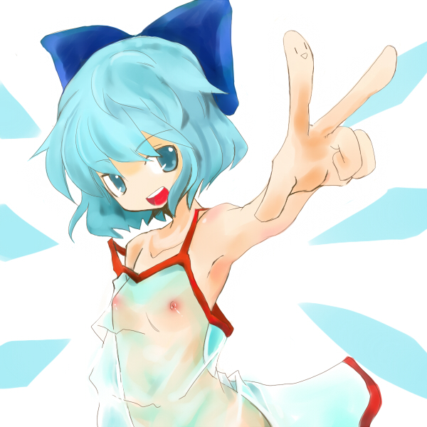 1girlarmpitsblue hairbreastsfemale focusflat chestforeshorteningnipplesribbonsee-through clothesshort hairsmilesolowings