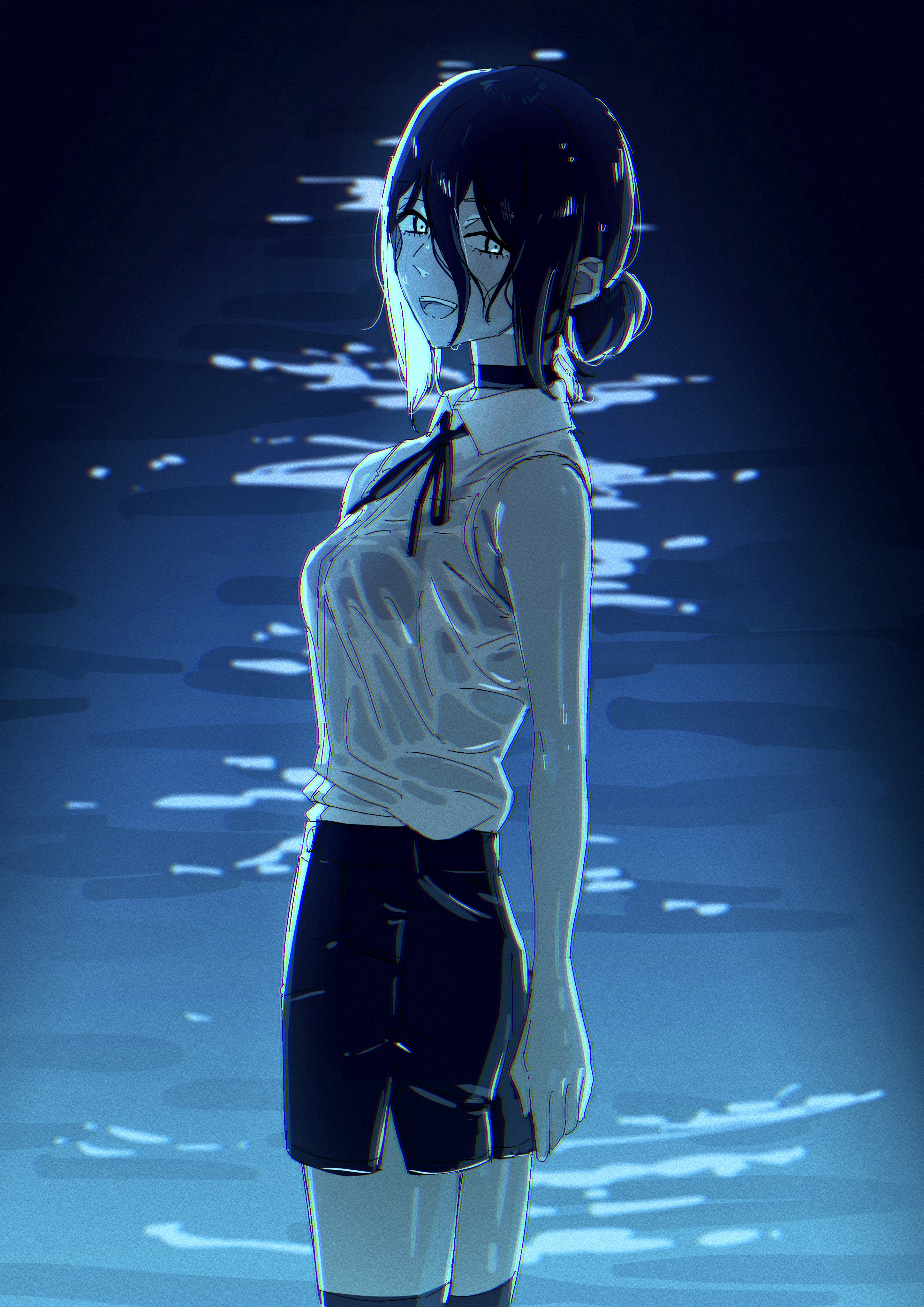 1girlblack chokerblack hairblack shortsbra visible through clothesbreastschokergreen eyeshair bunlooking at viewermedium breastsopen mouthshirtshortssleevelesssleeveless shirtsolowaterwetwet clotheswet hairwet shirtwhite shirt