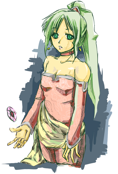 1990s (style)1girlcrystaldetached sleevesfemale focusgreen eyesgreen hairlong hairmatching hair/eyesponytailsolo