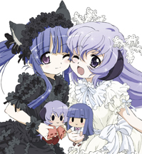 00s2girlsblack & whiteblue haircharacter dolldolldresshornsmultiple girlspurple hairsmilestuffed animalstuffed toy