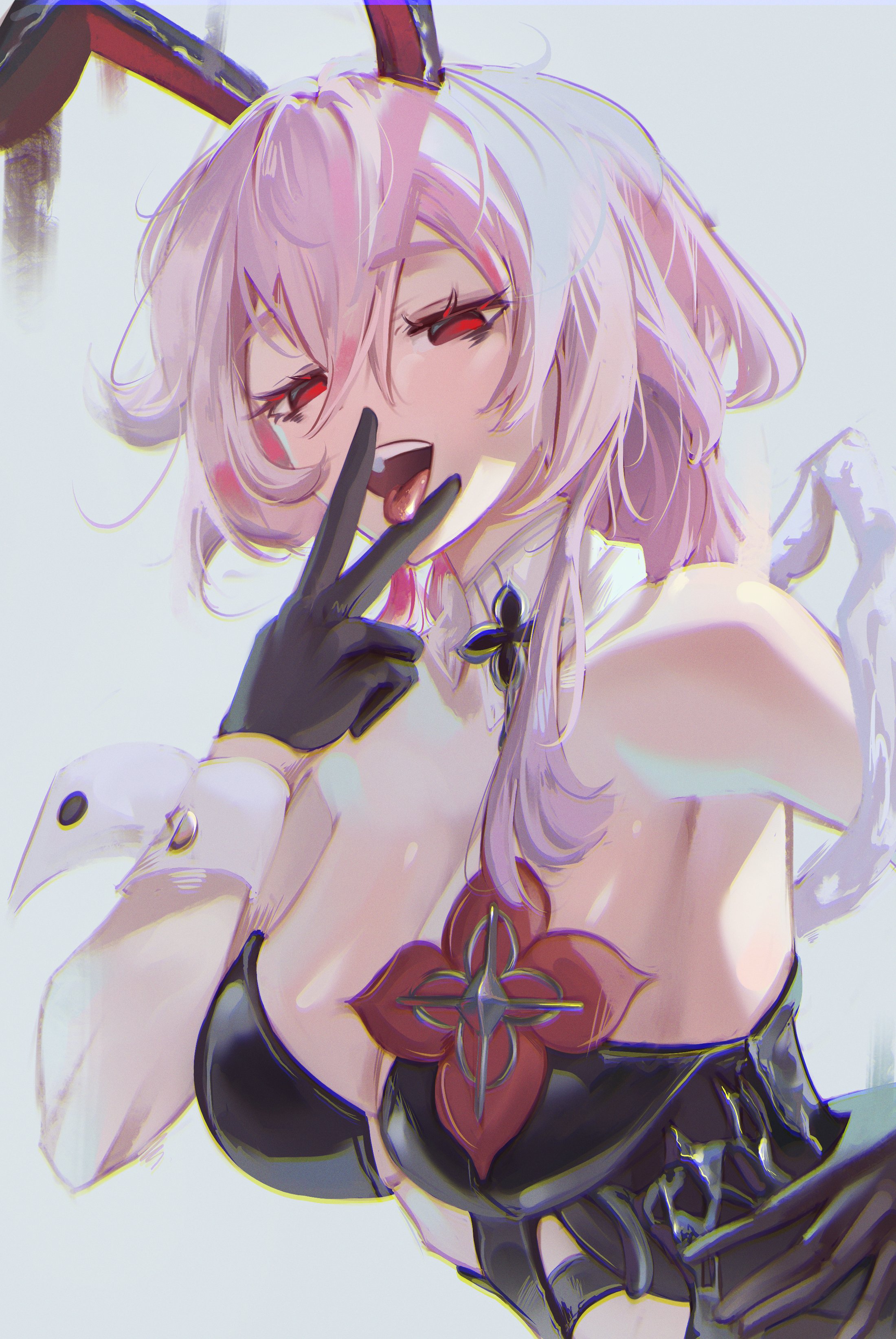 1girlalternate costumeanimal earsbare shouldersblack glovesblack leotardbreastscleavagefake animal earsgloveslarge breastsleotardlong hairopen mouthpink hairplayboy bunnyrabbit earsred eyessimple backgroundsolotonguetongue outvv over mouthwhite background