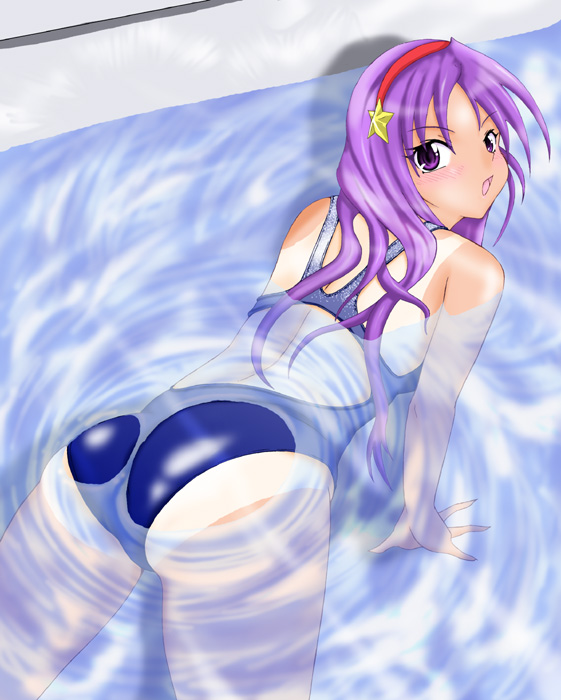 1girlall foursasscompetition swimsuitfemale focusfrom abovehair ornamenthairbandlooking at viewerlooking backlooking upone-piece swimsuitone-piece tanpartially submergedpoolpurple eyespurple hairred hairbandripplessolostar (symbol)star hair ornamentsubmergedswimsuittantanline