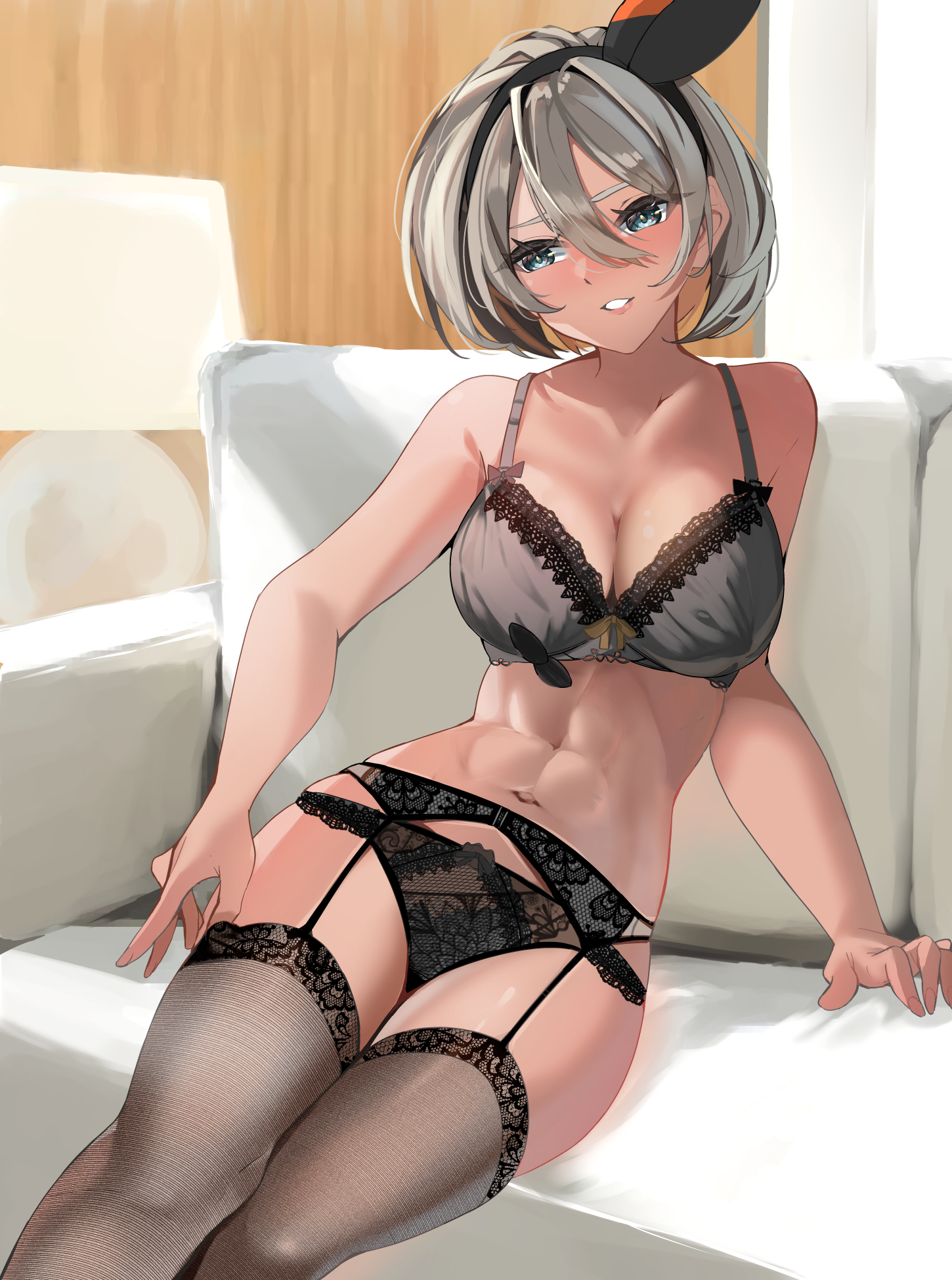 1girlabsalternate costumebare shouldersblack brablack hairbandblack pantiesblack thighhighsblushbow hairbandbrabreastscleavagecollarbonecouchdark skindark-skinned femalegarter beltgarter strapsgrey eyesgrey hairgrinhair between eyeshairbandindoorslacelace trimlamplarge breastslingerielooking at viewermidriffnavelopen mouthpantiesshort hairsittingsmilesolothighhighsunderwear