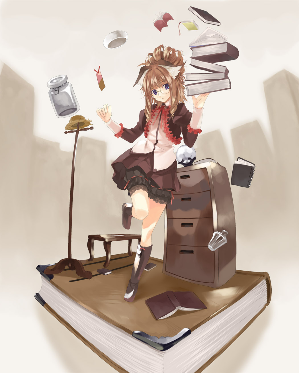 1girlanimal earsbookbootsbrown hairfemale focusglasseshatoversized objectpurple eyessolostandingstanding on one legstraw hat