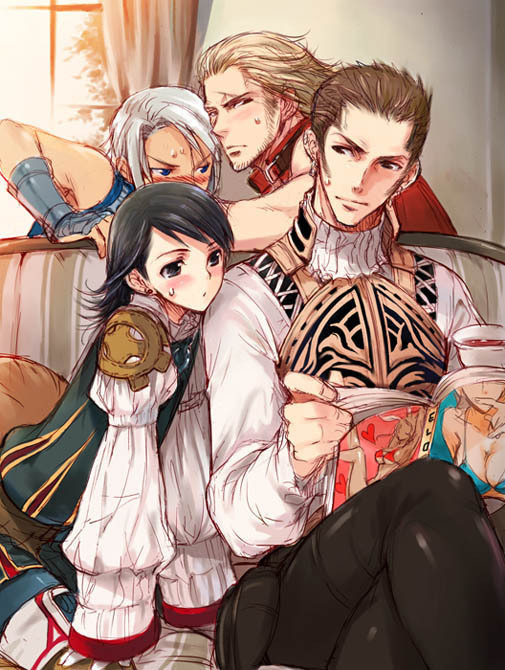 00s4boysage differencearmorblonde hairblue eyesblushbreastsbrown eyesbrown haircleavagecoffeecupdrinkearringsgauntletsglovesjewelryleatherleather pantsmagazine (object)male focusmultiple boyspantsscarshirtvestwhite hairwhite shirt