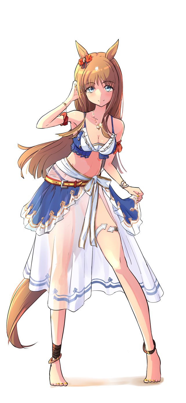 1girlanimal earsankletbare shouldersbikiniblue bikiniblue eyesblue sarongblushbowbraceletbreastsbrown haircleavageclosed mouthcollarboneear bowear ornamentear ribbonhorse earshorse girlhorse tailjewelrylong hairlooking at viewermedium breastsmulticolored hairnecklacesarongscrunchiesee-through clothessee-through sarongsimple backgroundsmilesoloswimsuittailwhite backgroundwhite bikiniwhite hair
