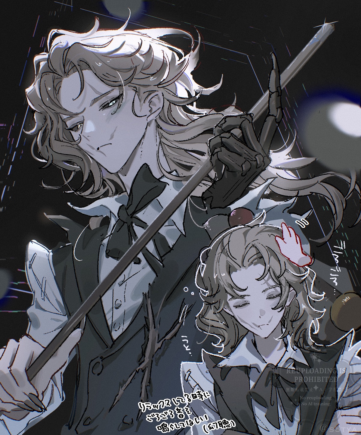 1boyblack bowblack sclerablack vestblonde hairbowc:clawsclosed eyescolored scleradisembodied handholdinglong hairlooking at viewerlooking downmale focusmarcus thornemechanical handspettingscarscar on faceshirttorn clothesvestwatermarkwavy hairwhite shirt