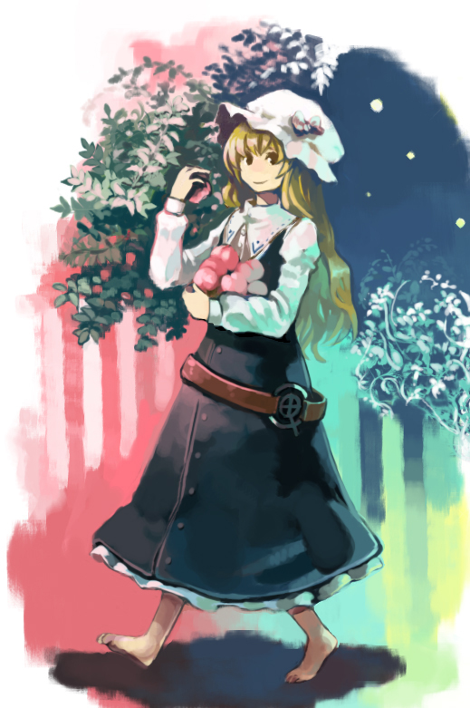 1girlbarefootbeltblonde haircarryingfemale focusfoodfruitfull bodyhatlong hairpeachplantsolostandingwalking