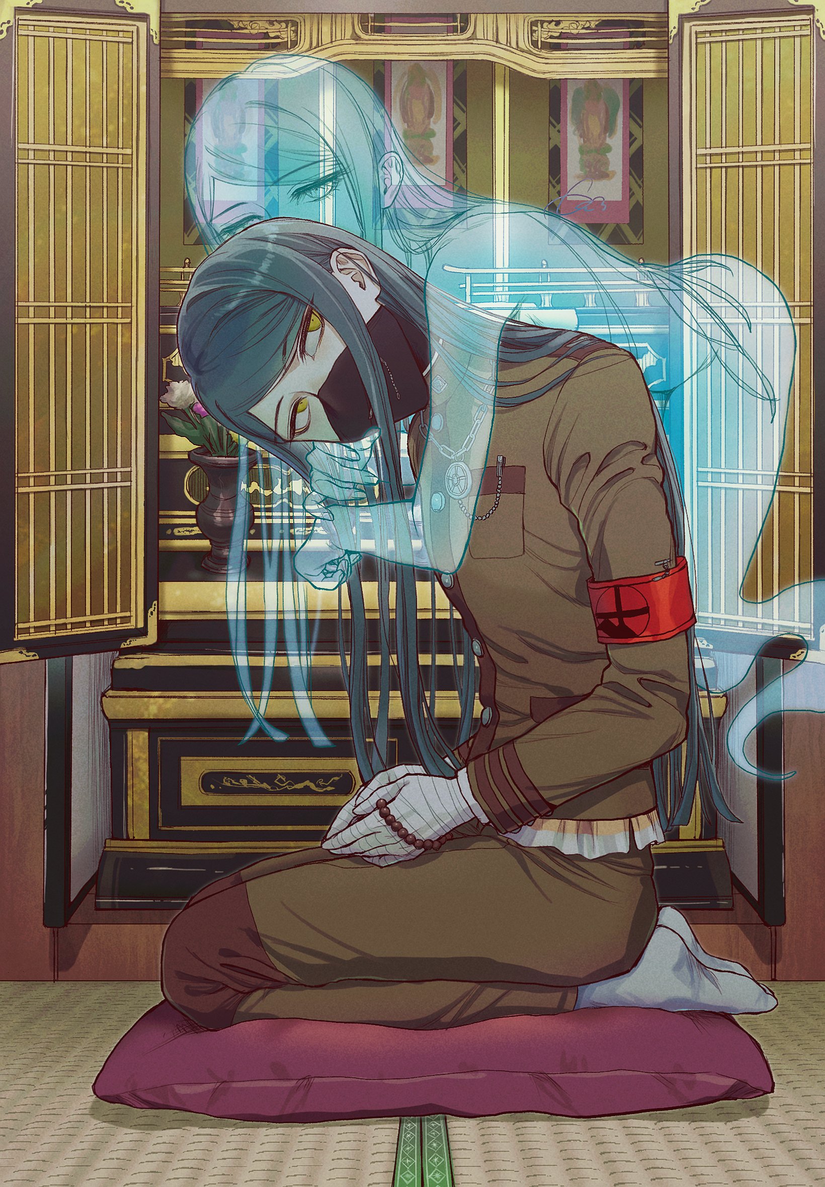 1boy1girlarmbandbandaged handbandagesblack maskblue hairbreast pocketbrother and sisterchainchain necklacecovered moutheyelashesfingernailsflowerfull bodyghost tailgreen jacketgreen pantshughug from behindindoorsjacketjewelrykneelinglong hairmaskmouth masknecklaceno shoespantspillowpocketred armbandsiblingssocksvasewhite socksyellow eyes