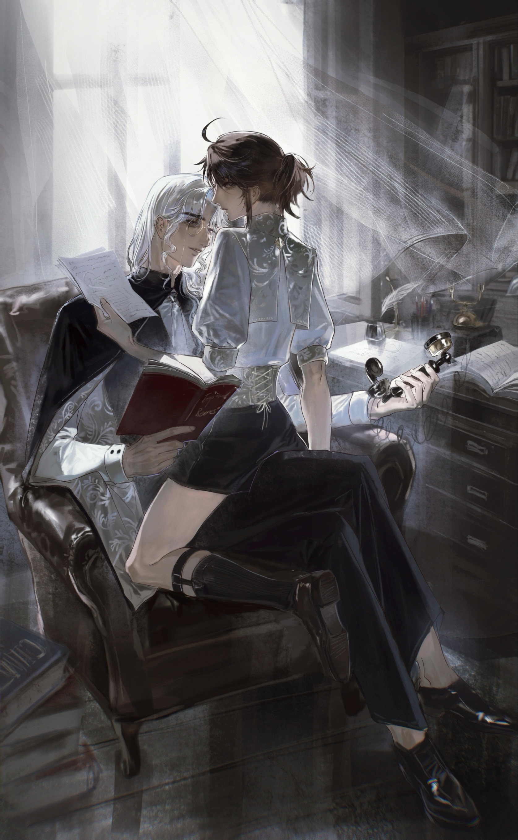 2boysahogealternate costumealva lorenzarmchairbookbrown hairchaircorsetcrossed legscurtainsdeskdress shoesfloating curtainsglasseshair intakesholdingholding bookholding paperholding phoneinkwelllegwear garterlong hairlooking at viewerlooking backmultiple boysopen bookpaperpencilphoneponytailpuffy sleevesround eyewearsanyazhaoshirtshort shortsshortssittingsitting on lapsitting on personwavy hairwhite corsetwhite hairwhite shirtwindwooden floor