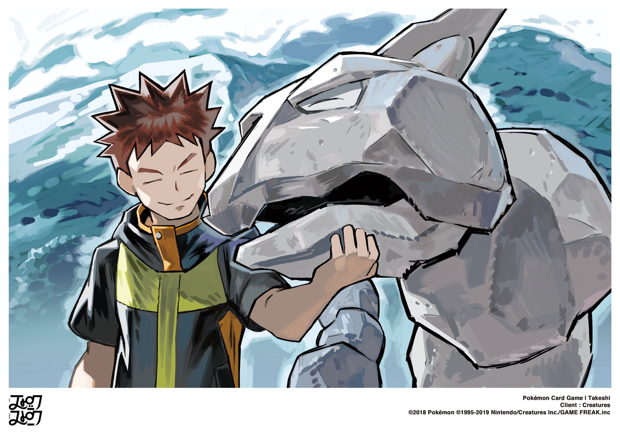 1boyborderbrown haircharacter nameclosed eyesclosed mouthcompany namecopyright namecopyright noticegen 1 pokemonhand on another's chinmale focusopen mouthpokemon (creature)short hairshort sleevessmilespiked hairv-shaped eyebrowswhite border