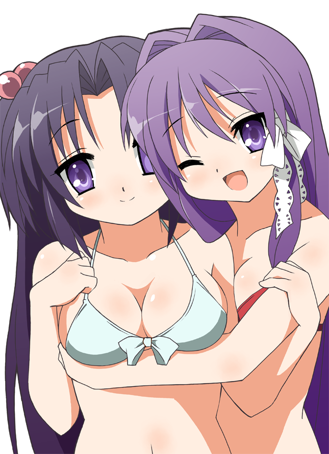00s2girlsbikiniblushbreastscleavagehuglarge breastslong hairmultiple girlspurple eyespurple hairsmileswimsuitwink