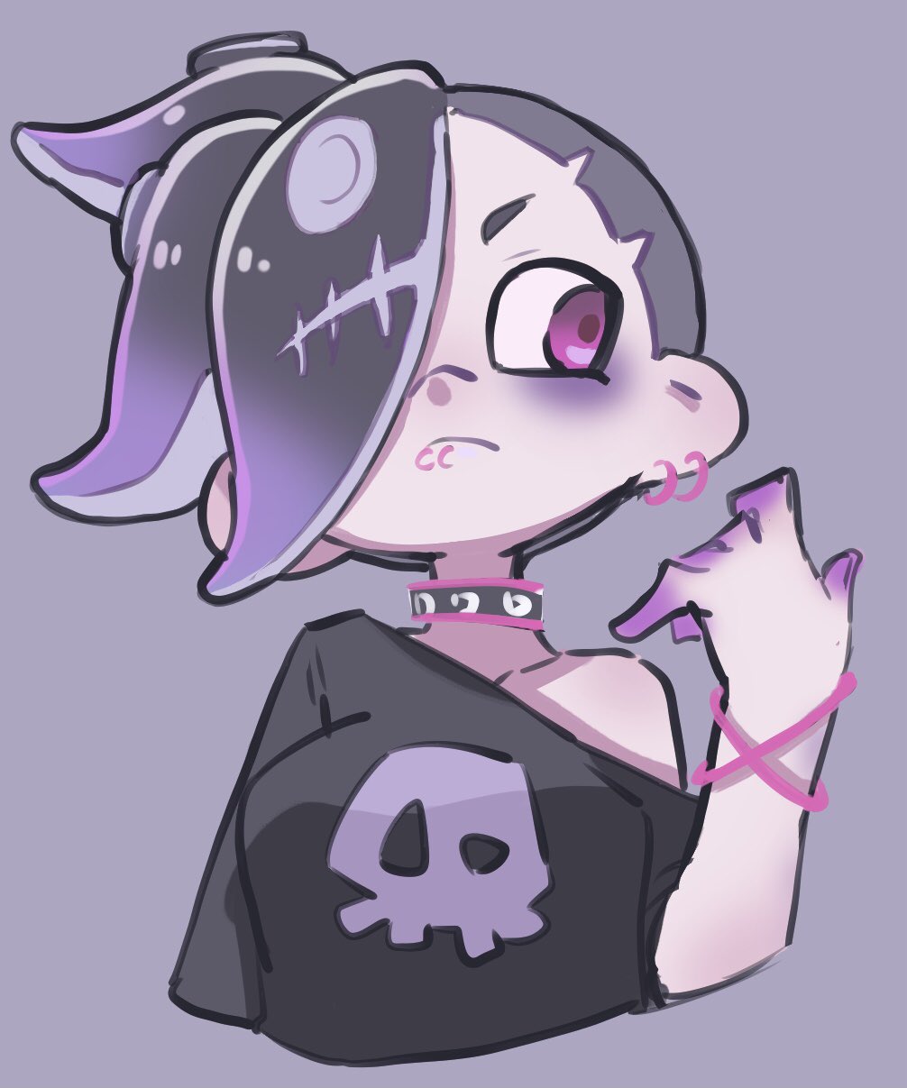 1girlasymmetrical hairblack hairblack shirtbreastschokerclosed mouthcropped torsoearringsface piercinghair over one eyeinklingjewelrymouth piercingpiercingpink eyespurple backgroundscarshirtshort hairsidecutsimple backgroundsingle bare shoulderskull printsolotentacle hairundercut