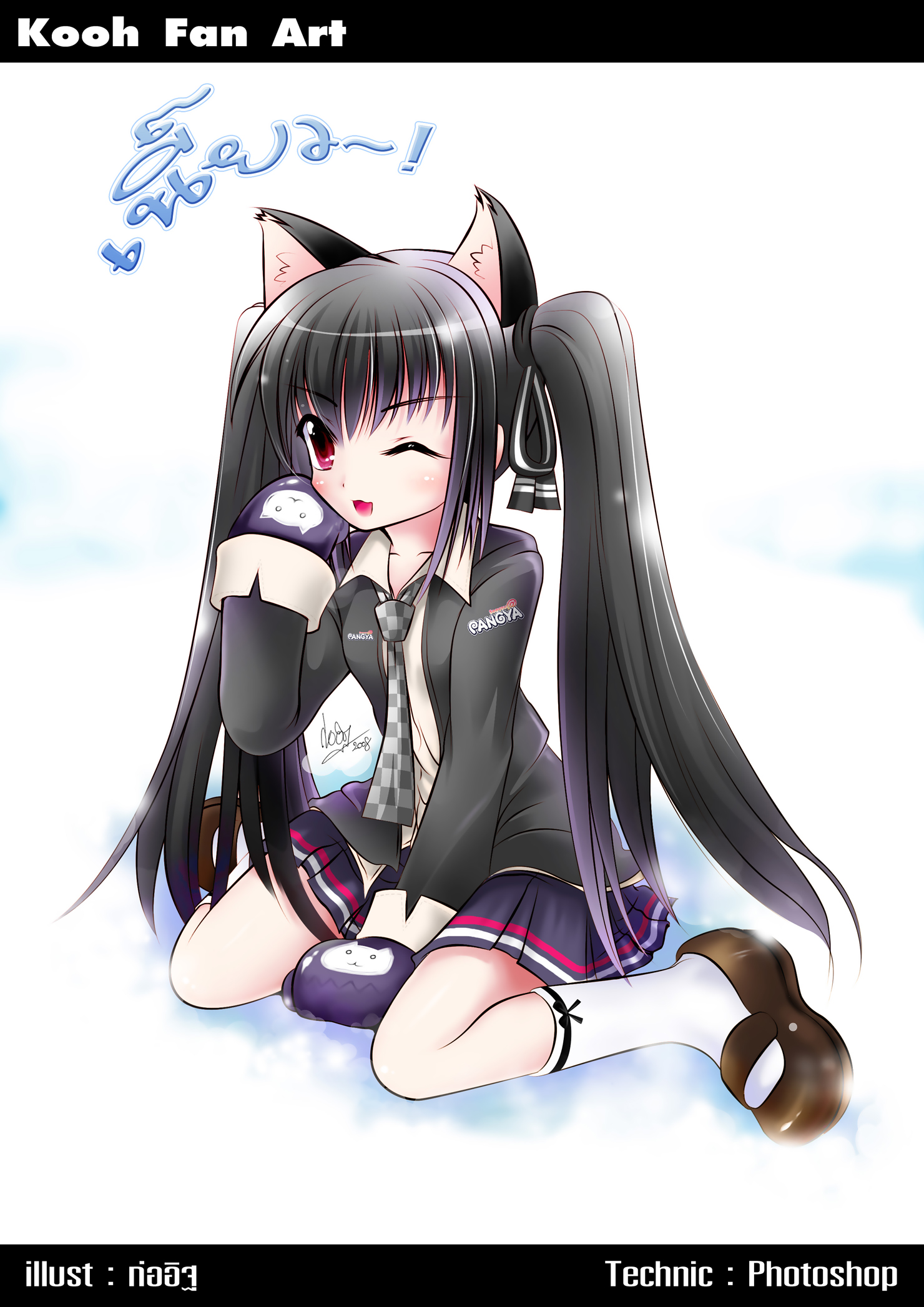 1girlanimal earsblack hairblushfemale focusgloveslong hairone eye closedred eyesskirtsockssolothai texttwintailswink