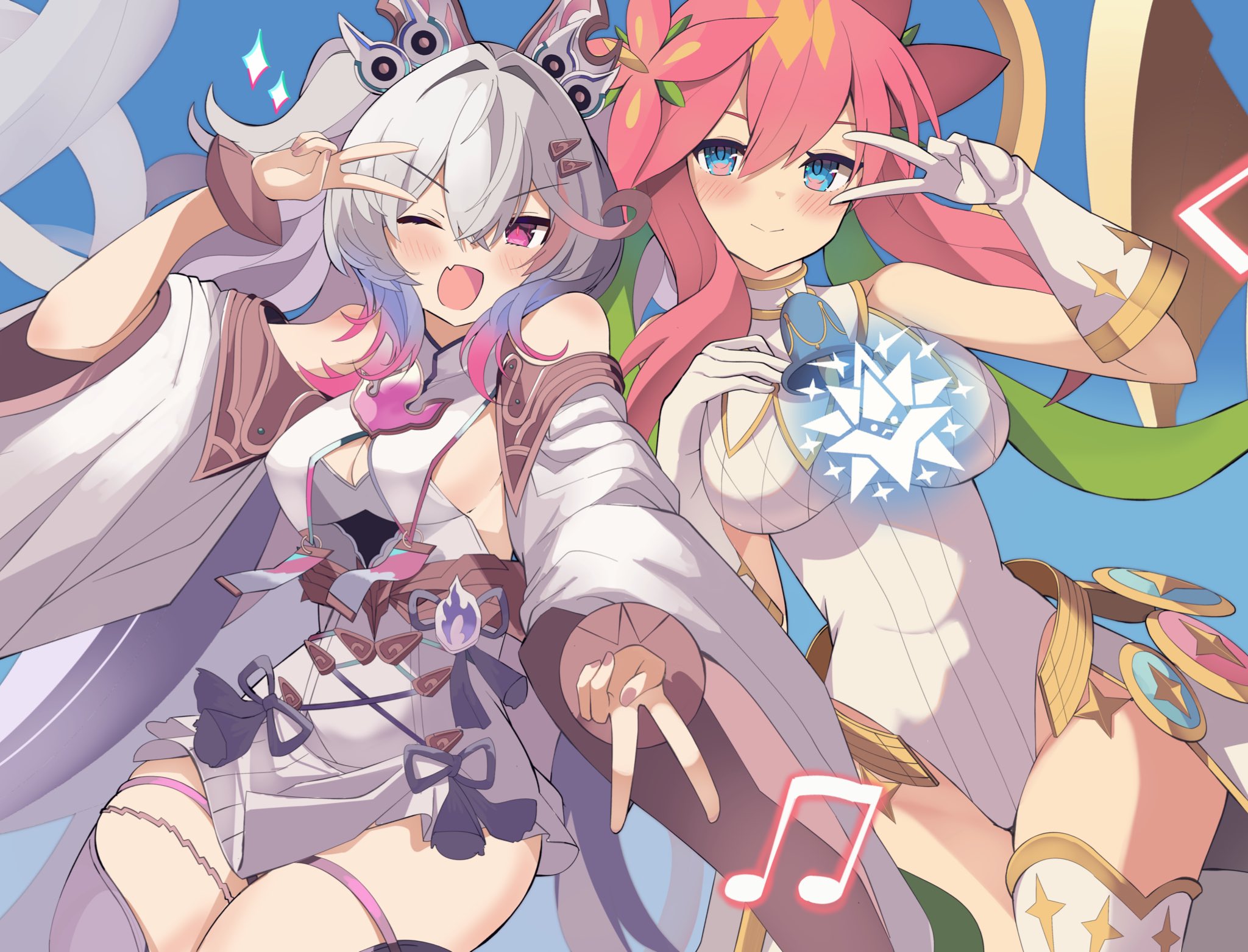 2girlsbanglebare shouldersbeamed eighth notesbellblonde hairblue backgroundblue eyesbraceletbreastscleavage cutoutclosed mouthclothing cutoutdetached sleevesdouble vfangflowerglovesgold trimgradient clothesgreen hair ornamentgrey hairhair flowerhair ornamentjapanese clothesjewelrykimonoleotardlong hairmagic circlemulticolored eyesmulticolored hairmultiple girlsmusical noteneck bellone eye closedopen mouthpink eyespink hairpurple hairrafululu love (duel masters)sparklethigh strapvv over eyevery long hairwhite gloveswhite leotard