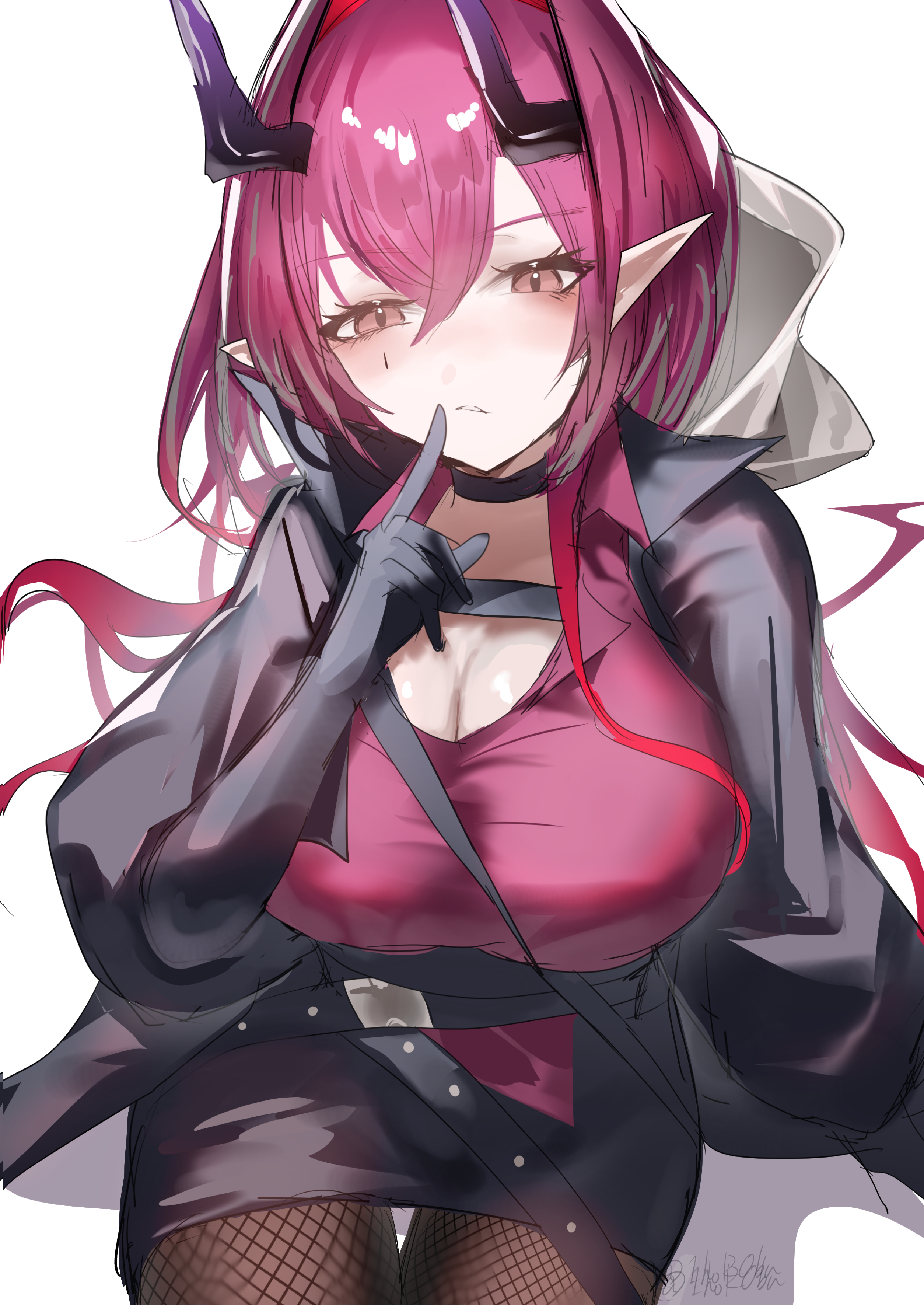 1girlblack jacketblack skirtbreastsbrown eyesbrown pantyhosecleavagecowboy shotfinger to mouthfishnet pantyhosefishnetshair between eyeshornshuge breastsjacketlong hairlooking at viewerminiskirtpantyhoseparted lipspink hairpink shirtpointy earspurple hornsshirtsimple backgroundsittingskirtsolowhite background