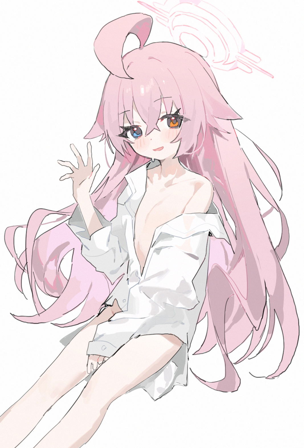 1girlahogeblue eyesflat chesthaloheterochromialong hairpink hairshirtsimple backgroundsolowhite backgroundwhite shirt