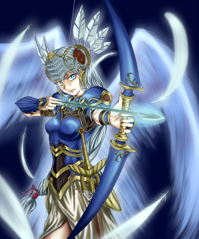 1girlarmorarmored dressarrow (projectile)blue armorblue eyesbow (weapon)dressfeathersgrey hairhelmetlong hairlow-tied long hairmarksmansheathsheathedswordvalkyrieweaponwings