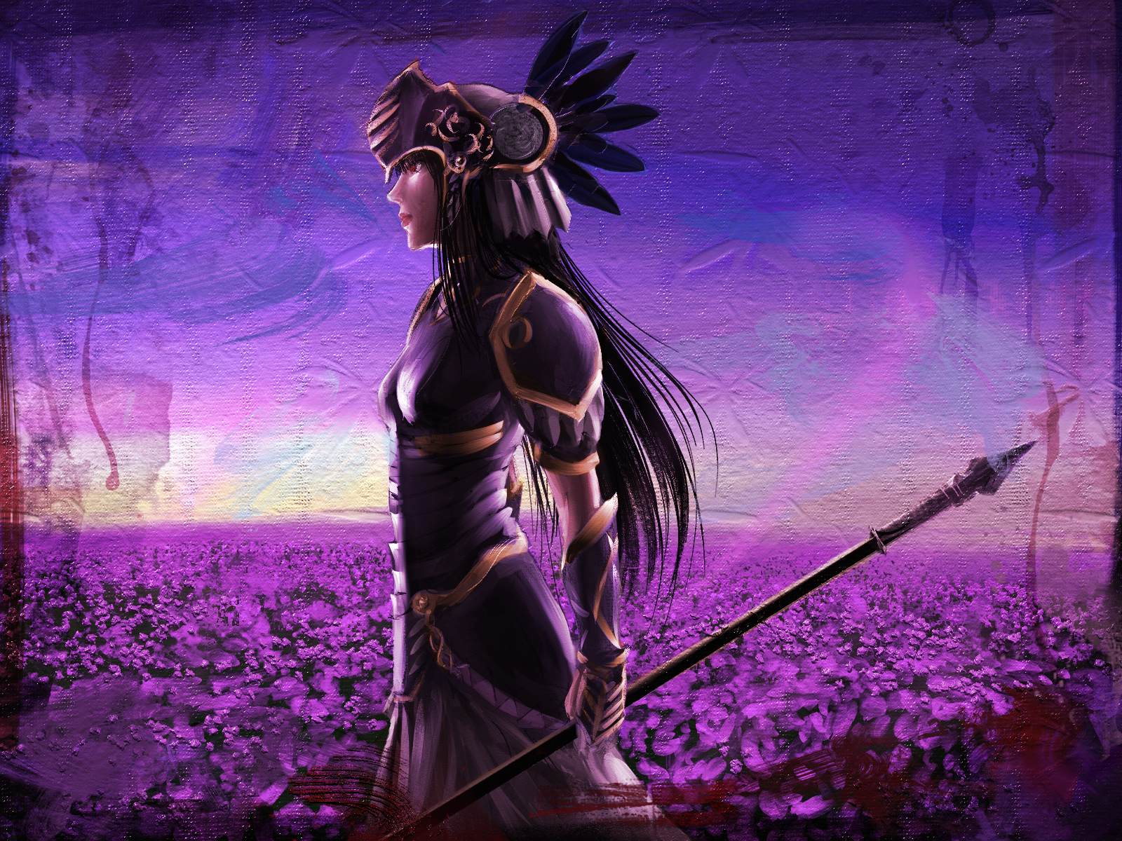 1girlarmorarmored dressblack hairbrown eyesdressfeathersfemale focushelmetlong hairpurple backgroundsolostaff