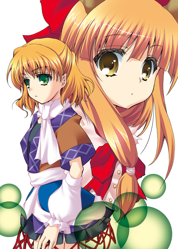 2girlsdanmakufemale focusgreen eyeshornslong hairmultiple girlsorange hairpointy earsribbonshort hairsimple backgroundstandingwhite backgroundyellow eyes