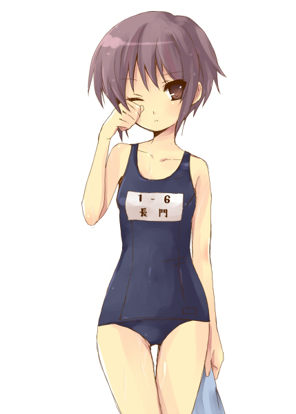 00s1girlbrown eyesbrown hairfemale focusone-piece swimsuitpurple hairschool swimsuitshort hairsoloswimsuit