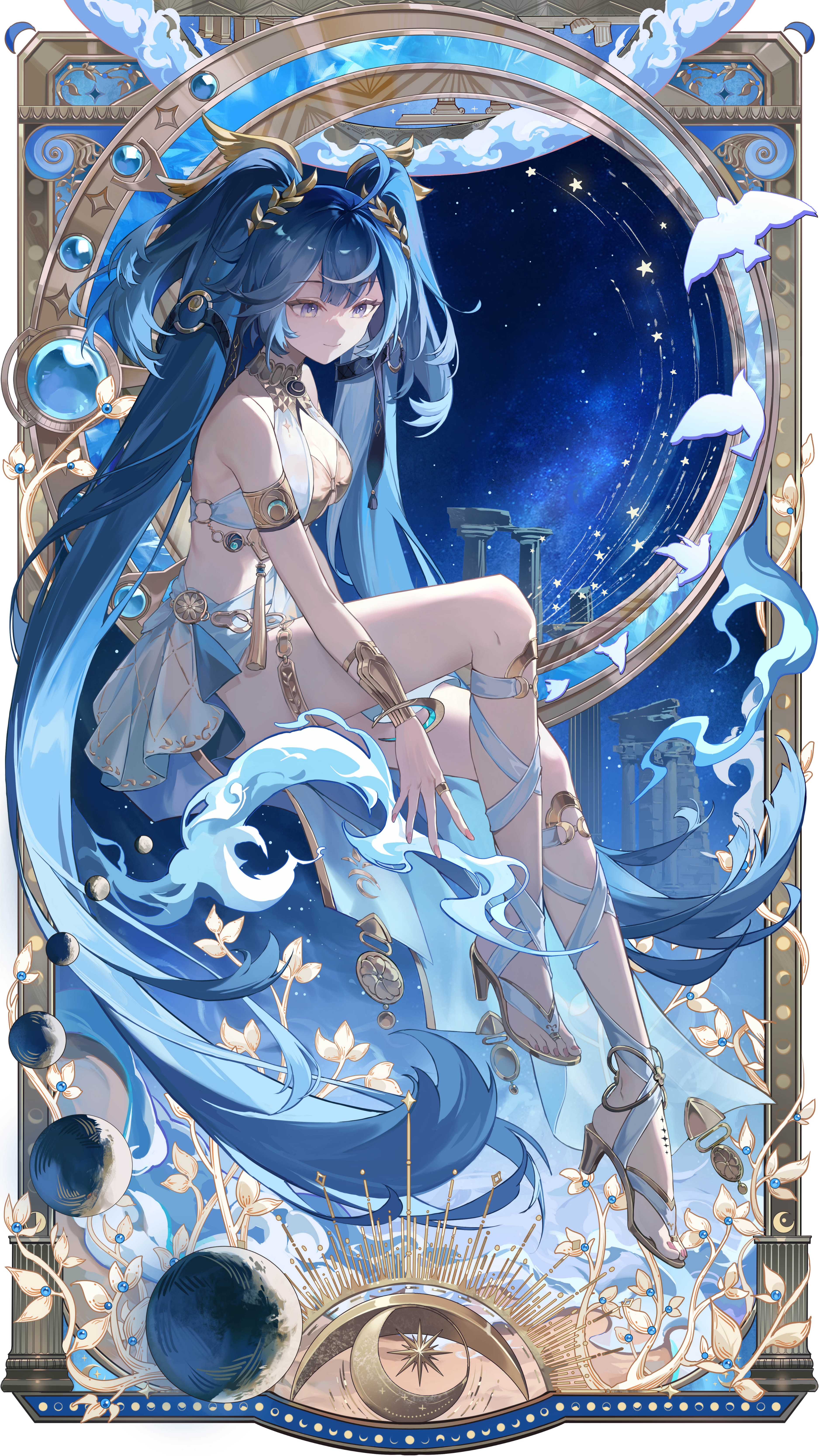1girlahogearmletbare shouldersblue eyesblue hairbreastscleavageclosed mouthfull bodygladiator sandalsgold bragreco-roman clotheshigh heelsjewelrylaurel crownleg wraplong hairlooking downsandalsshowgirl skirtsittingsmilesolotacet mark (wuthering waves)thighletthighstwintailsvery long hair