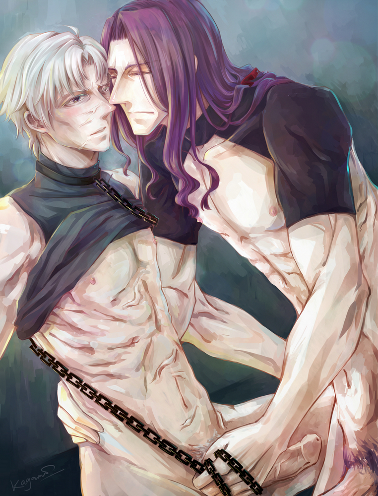 isurugiratone, vlov arkhangel, limbus company, project moon, tsukihime, tsukihime (remake), highres, 2boys, ascot, coat, cosplay, costume switch, formal clothes, fur coat, gloves, hair between eyes, hand on own hip, jewelry, la manchaland's don quixote (project moon), la manchaland's don quixote (project moon) (cosplay), long hair, look-alike, looking at another, male focus, multiple boys, necklace, red eyes, smile, vlov arkhangel(cosplay), white gloves, white hair