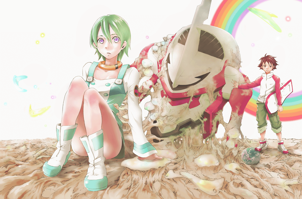 00sbootsbrown eyesbrown haircollarcomicdressearth (planet)green hairmechaplanetpurple eyesraglan sleevesrainbowrobot