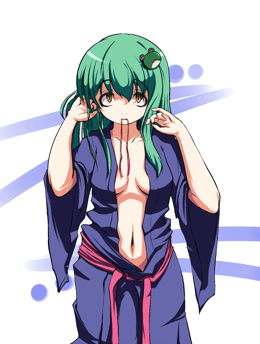 1girlbreastsfemale focusgreen hairjapanese clotheskimonolong hairnavelopen clothessolostandingwhite background