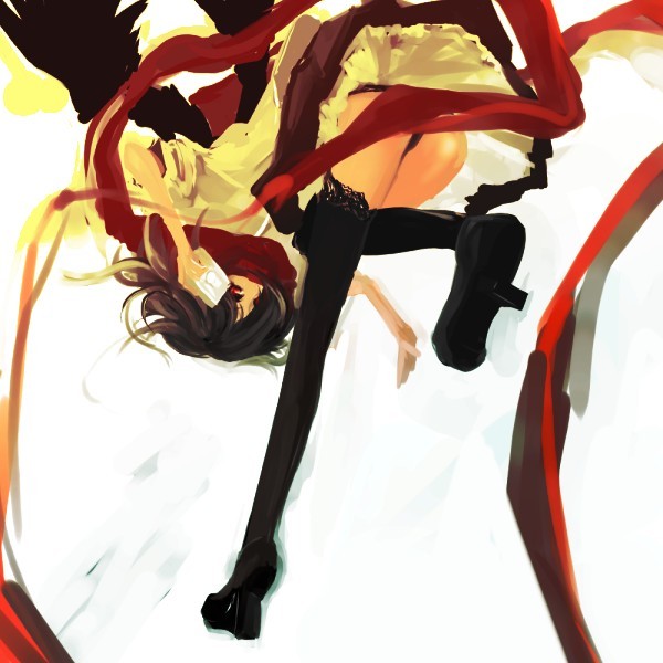 1girlblack hairexpressionlessfemale focusflyinggetapantiesshort hairskirtsolotengu-getathighhighsunderwearupside-down