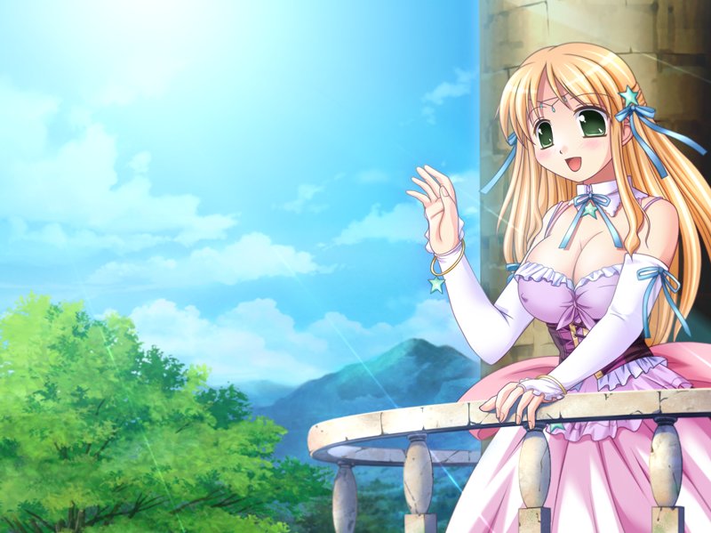 1girlblonde hairblushbraceletbreastscleavagecorsetdresselbow glovesfemale focusglovesgowngreen eyesjewelrylarge breastslong hairprincessribbonsolo