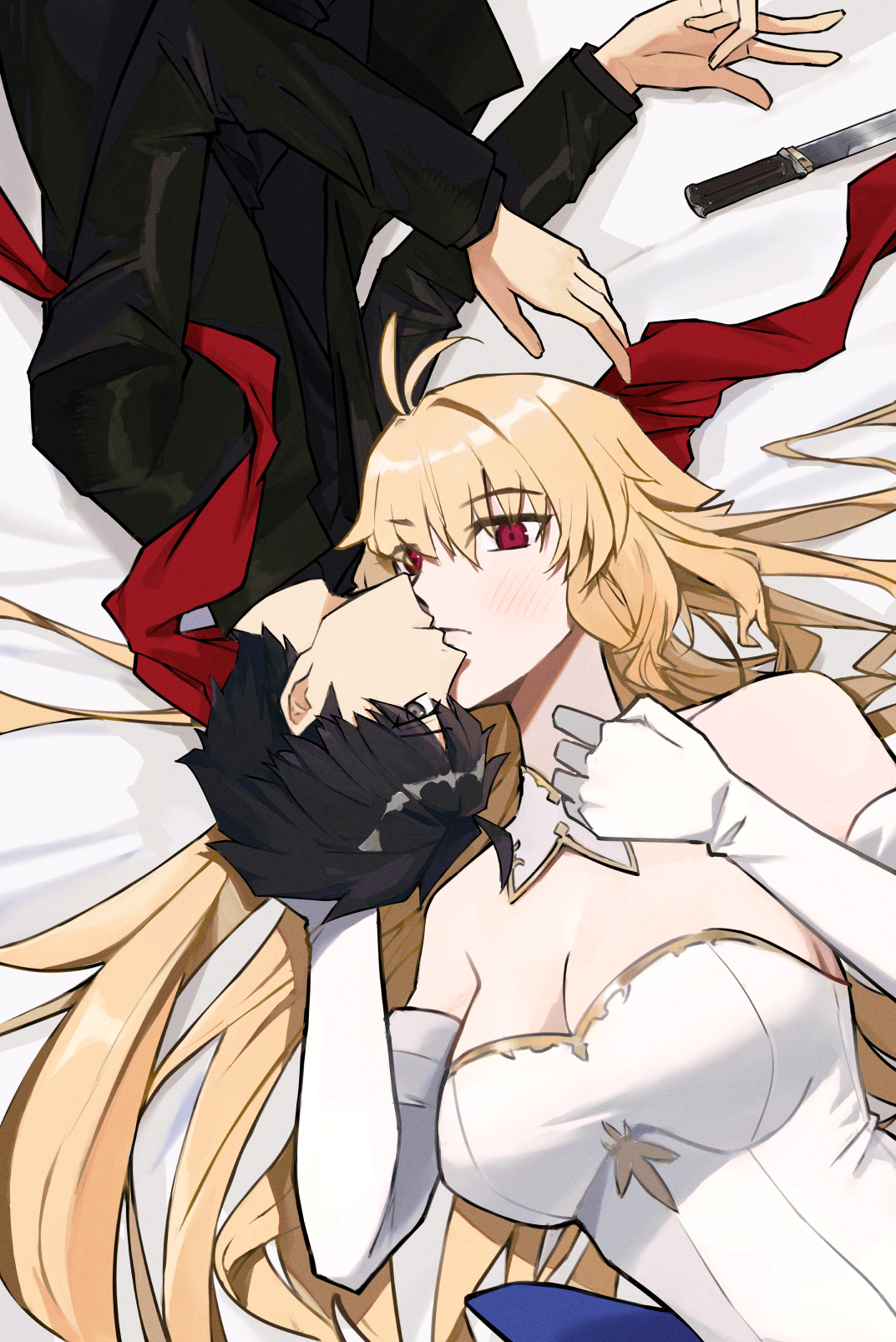 1boy1girlahogeantenna hairbare shouldersblack hairblack jacketblack shirtblonde hairblushbreastscleavageclosed mouthcollardaggerdetached collardresselbow glovesglovesgrey hairhand on another's headheterojacketkissknifelarge breastslong hairlooking at viewerlooking to the sidelyingnoseon backon bedred ribbonribbonshirtshort hairupper bodyweaponwhite collarwhite dresswhite gloves
